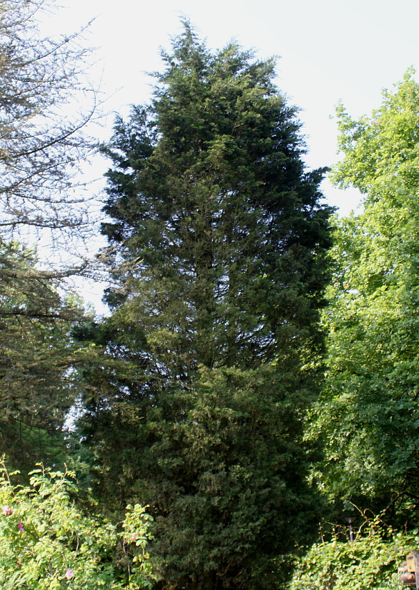It is a monoecious, less often dioecious evergreen conifer up to 30 m in height, with a trunk diameter of 150 cm. It grows slowly. Crown compact, columnar, dense, later becoming oval, spreading or broad-pyramidal. Bark brown or gray, peeling off in soft longitudinal strips. Shoots numerous, indistinctly four-angled. Young shoots green, thin.