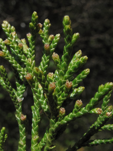 Juvenile foliage up to 12 cm long, awl-shaped, growing in pairs, less often in whorls of 3, thin-pointed, gray-green with white stripes, green beneath. Later the foliage becomes scale-like – shortly appressed, arranged oppositely in pairs in 4 rows, diamond-shaped, pointed, green or bluish-green, turning brownish in winter. Small tufts of juvenile leaves often occur at the tips of shoots on mature plants.
