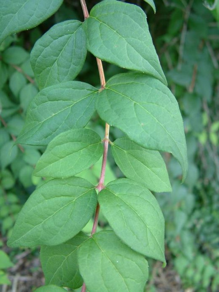 Листья парные, расположены супротивно, овальной формы, заостренные, с округлым основанием, 3,5-8 см в длину, темно-зеленого цвета, сверху по краям редко покрыты волосками, снизу – густоопушенные, более светлые. Осенью приобретают ярко-желтые тона.