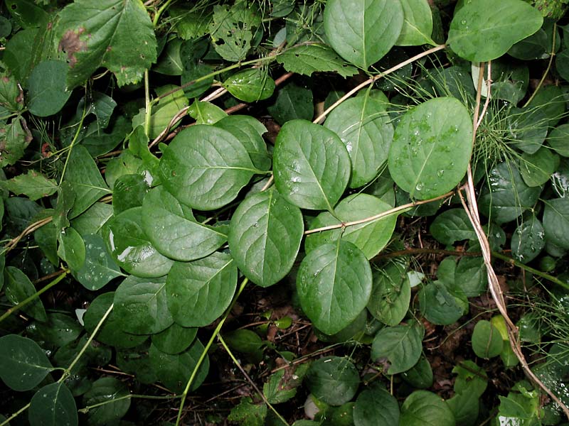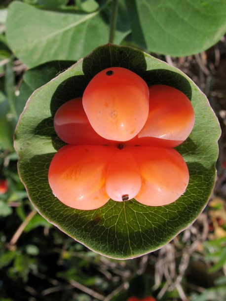 Leaves are opposite, elliptic or broadly elliptic in shape, 4-10 cm long, leathery, firm, dark green above and bluish-gray beneath. 2-3 pairs of the upper leaves are fused at the bases into a symmetrical elliptical disc. Leaves retain their color until late autumn and are among the last to fall in the garden.