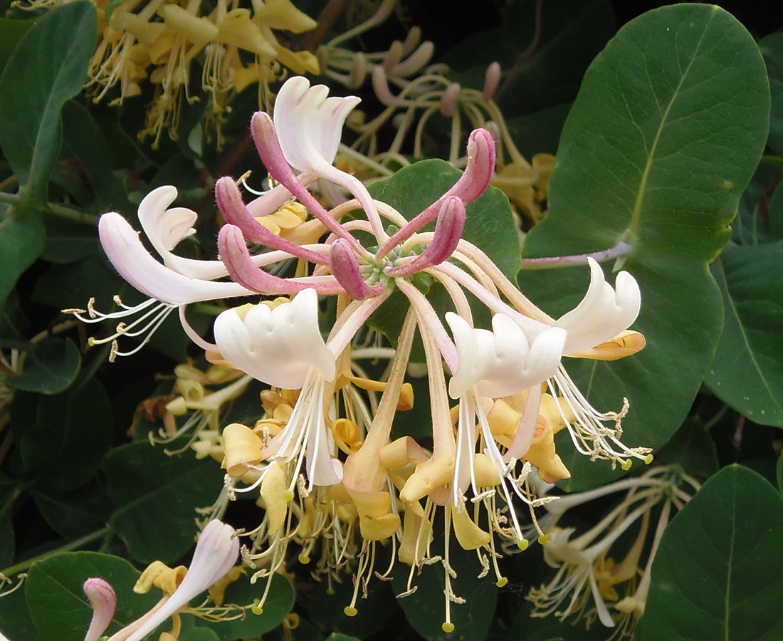 Flowers are sessile, grouped in whorls of 3-10 flowers, with usually one terminal whorl developing on a shoot. Bracts are small, free, shorter than the ovary, ovate, often glandular at the margin, and often entirely absent. The calyx limb reaches 1 mm in length, divided into 5 triangular teeth that are glabrous or glandular at the margin. The stamens protrude well. Flowers reach 5 cm in length, white or yellowish inside, purple or with a purplish-red tint outside, very fragrant, especially in the evening hours. A flower lives on average 3-4 days; flowering continues for 3 weeks. Blooms and bears fruit from 4 years of age. Fruits are orange-red berries, on short pedicels "glued" to the leaf.