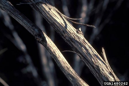 Кора светло-серая, отслаивается крупными пластинами. Побеги светло-серые, молодые – покрыты густым опушением из коротких волосков.