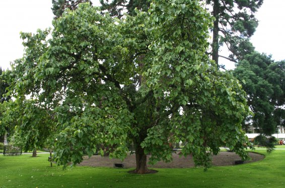 Представляет собой листопадное дерево до 12 м в высоту и 155 м в ширину. Крона широкая, раскидистая. Ветки у взрослых деревьев многочисленные, широкие, короткие, коричнево-бурой окраски. Кора на стволе трещиноватая, серого цвета.