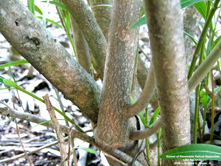 Представляет собой крупный вечнозеленый кустарник 2-6 м в высоту. Стебли ветвящиеся, буроватого цвета, покрыты округлыми чечевичками. Молодые побеги покрыты сизоватым налетом. Кора серая.
