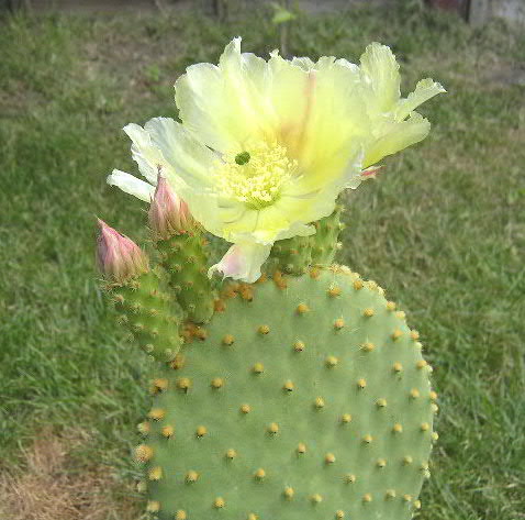 Цветы многочисленное, до 10 цветков на одном членике. Цветет в середине лета. Цветы лимонно-жёлтые, в диаметре достигают 3—5 сантиметров. Плоды сочные, лиловато-красные. Цветёт в основном в оранжереях, достигнув достаточно крупных размеров. При выращивании в квартире, довольно сложно добиться цветения. Рекомендуется выращивать опунцию в очень широких ёмкостях. На весь вегетационный период кактус следует выставить на открытый воздух, стараясь избегать перемещения ёмкости с растением. Наиболее охотно цветёт после длительной сухой зимовки.