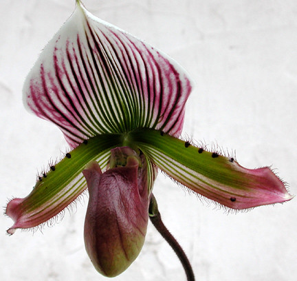 Происходит из Северной Индии. Компактное растение с цветками, вытянутыми по вертикали. Верхний чашелистик яйцевидно-продолговатый, с волосистым килем снизу, по краю сильно-волнистый, белый с многочисленными винно-красными продольными линиями. Лепестки причудливо изогнуты, желтовато-белые, с продольными фиолетовыми линиями и такого же цвета каймой по сильноволнистому, почти курчавому краю, усаженному пучками мелких темных волосков. Губа красновато-зеленая с более темными жилками.