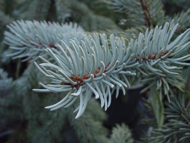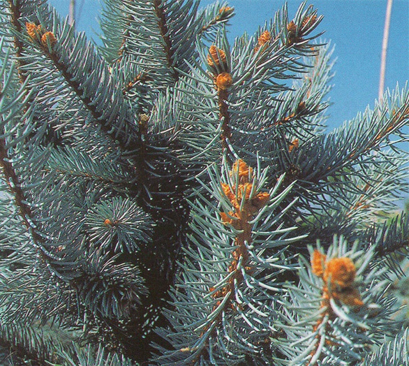 Хвоя игольчатая, жесткая, острая, 2-3 см в длину, красивого насыщенно-голубого цвета с серебристым оттенком. Сохраняется на ветках 4-6 лет. Молодой прирост хвои имеет светло-голубой цвет. Очень эффектный вид имеет в мае, за счет контраста старо и молодой хвои.