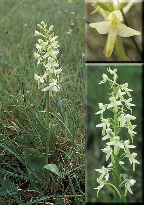 Соцветие — редкий цилиндрический колос, достигает 20 см в длину, состоит из 8—40 цветков. Цветки — с белыми, слегка зеленоватыми на концах околоцветниками; губа узкая линейная или ланцетная, 12 мм длиной, при основании без бугров над средней жилкой; с параллельными пыльниками 2 мм длиной. Шпорец тонкий, слегка изогнутый, на конце заострённый, горизонтальный или косо вверх направленный. Прилипальца округлые. Поллинарий короче 2,5 мм. Цветы обладают сильным приятным ароматом (особенно вечером и ночью или при пасмурной погоде). Цветёт в июне — июле.