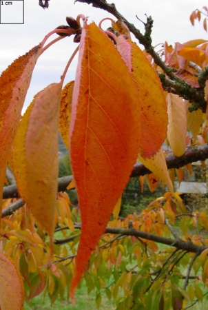 Leaves alternate, broadly elliptic, with a slightly serrated margin, up to 15 cm long, glossy, reddish-brown when unfolding, green in summer, turning yellow-orange or crimson in autumn.