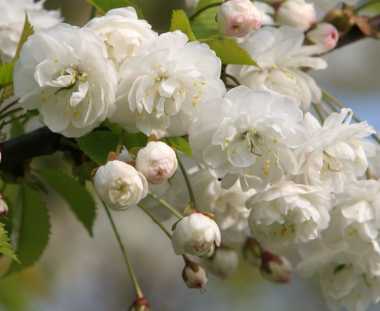Blooms profusely in April-May. Flowers snow-white, double, resembling small roses, 2-3 cm in diameter, borne 2-5 together in pendent inflorescences. Flowers appear together with the leaves. Blooms about a week longer than bird cherry. Does not bear fruit.