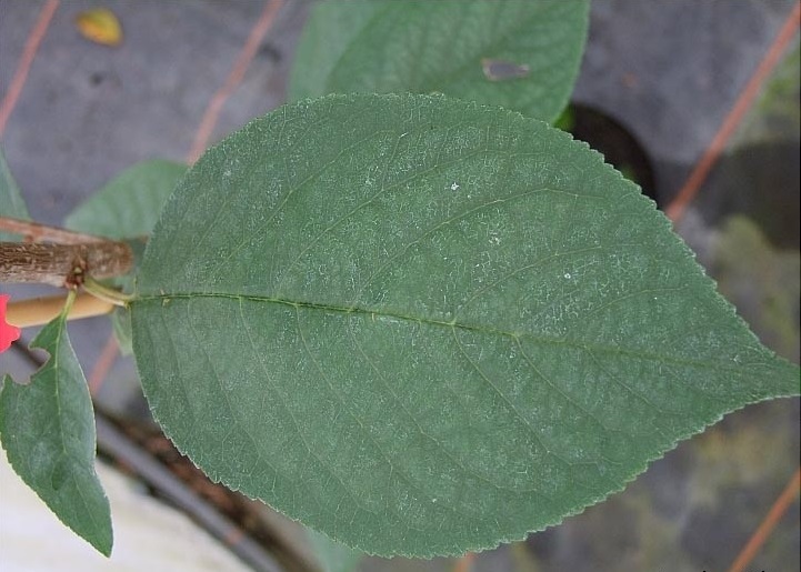 Листья черешковые, широкоэллиптические, заострённые, тёмно-зелёные сверху, снизу светлее, с зубчатыми краями, заостренные.