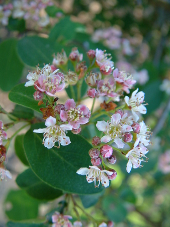 Цветы мелкие, 9-10 мм в диаметре, розовые, собраны в соцветия по 3-9 штук. Цветет обильно и продолжительно, 3-4 недели, в июне. Начинает цвести с 8 лет.