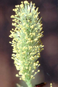 Сережки мелкие. Мужские – 1-1,5 см в длину, около 0,6 см в диаметре, серовато-белые, при цветении желтые, на длинной опушенной ножке. Женские сережки 2-4 см в длину и 4 мм в диаметре, с 3-5 листочками у основания. Прицветные чешуйки яйцевидной формы, тупые, желто-зеленого цвета. Тычинок 2, пыльники желтые, яйцевидные, с 2 тупыми, яйцевидными нектарниками. Завязь продолговатая, сидячая, голая, рыльца короткие, раздельные, яйцевидные; нектарников 2 – внутренний имеет яйцевидно-продолговатую форму, суженную к верху, довольно толстым, наружный – маленький. Цветет в начале мая.