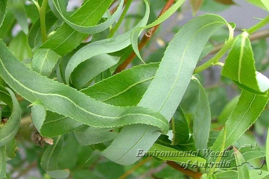 Leaves are alternate, narrowly lanceolate, 5-10 cm long, with a finely serrated margin, light green above, bluish or whitish below, slightly spirally twisted. In autumn they take on golden-yellow tones.
