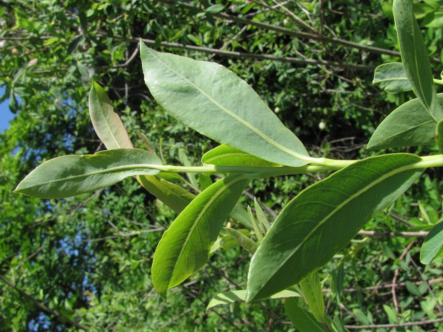 Почки прижатые, 3-5 мм в длину, красно-бурого или желтого (цветочные) цвета, голые, часто супротивные. Прилистники линейно-ланцетной формы, 1,5-1,8 см в длину, с пильчатым краем, рано опадающие. Листья расположены очередно или супротивно, реже мутовчато по 3, густые, 3-12 см в длину и 0,8-1,5 см в ширину, узко-обратно-яйцевидной или обратно-ланцетной формы, с шиповидным остроконечием наверху, тонкие, нежного голубовато-сизого или сизо-зеленого цвета, реже зеленые с обеих сторон, цельнокрайние, на 3-6 мм черешках. При распускании листья опушенные, позже гладкие.