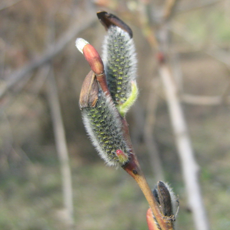 Сережки сидячие, боковые, цилиндрической формы, густоцветковые. Мужские сережки прямостоячие, 2-3 см в длину, прямостоячие, узкоцилиндрические, дуговидно изогнуты, реже прямые, с 2-3 небольшими листочками. Прицветные чешуйки обратно-яйцевидной формы, бледные, темнее наверху. Пыльники крупные, яркие, красно-пурпурного цвета, позже пурпурно-черные. Тычинок 2, со сросшимися волосистыми нитями 3,5 мм в длину; пыльник пурпурный, четырехгне здый, чернеющий; нектарник одиночный, продолговатый, задний, продолговато-яйцевидной формы. Женские цилиндрические, реже узкоцилиндрические, 2,8-3 см в длину и 2-4 мм в диаметре. Прицветные чешуйки продолговатой формы, красноватые, почти черные наверху, покрыты шелковистыми волосками. Завязь сидячая, короткая, полуповислая, загнутая или прямая, серая, позже темно-красная, яйцевидной формы. Рыльца красного цвета, очень короткие, сначала двуразельные, потом – 4-раздельные, расходящиеся. Цветет до распускания листьев или одновременно с ним, в марте-мае. Плодоносит в мае-июне.