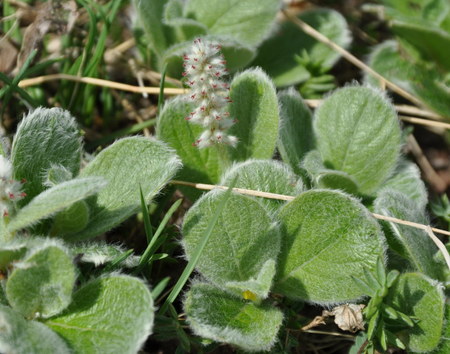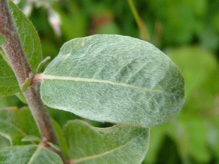 Прилистники ланцетной или эллиптической формы, 1-3 мм в длину, цельнокрайние, часто отсутствуют. Листья яйцевидной, эллиптической, обратнояйцевидной или ланцетной формы, с закруглённым или заостренным краем, со слабо суженным или тупым краем, реже сердцевидным, 2-3 см в длину и 0,5-2,5 см в ширину, с цельным или мелко и железисто-зубчатым краем, сверху матово-зеленого цвета, снизу бледные, серо-зеленые, с 4—6 парами жилок, с обеих сторон густо покрыты блестящими, шелковистыми волосками, позже сверху голые или почти голые. Черешки очень короткие, 1-3 мм в длину, волосистые.