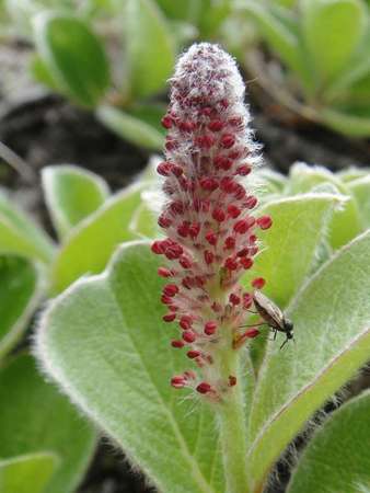 Цветет в апреле-мае. Цветочные почки 3-6 мм в длину, яйцевидной формы, с притупленным носиком, практически неуплощенные, более или менее белоопушенные. Сережки овально-цилиндрические или цилиндрические, плотные, растут на боковых веточках, достигают 0,5-1,5 см в диаметре. Мужские сережки до 2 см в длину, женские – 2-4,5 см. Прицветники 1,5-2 мм в длину, обратно- или широкояйцевидные, с черно-бурой длинноволосистой верхушкой. Завязь войлочно-опушенныя, растет на короткой ножке. Нектарники одиночные или парные, реже 3, 1-2 мм в длину, с 3-5 лопастями разной длины. Тычиночные нити в числе 2, голые, свободные. Столбик 0,5 мм в длину, расщепленный до основания, с отогнутыми долями. Рыльца двураздельные, до 1 мм в длину, с изогнутыми долями.