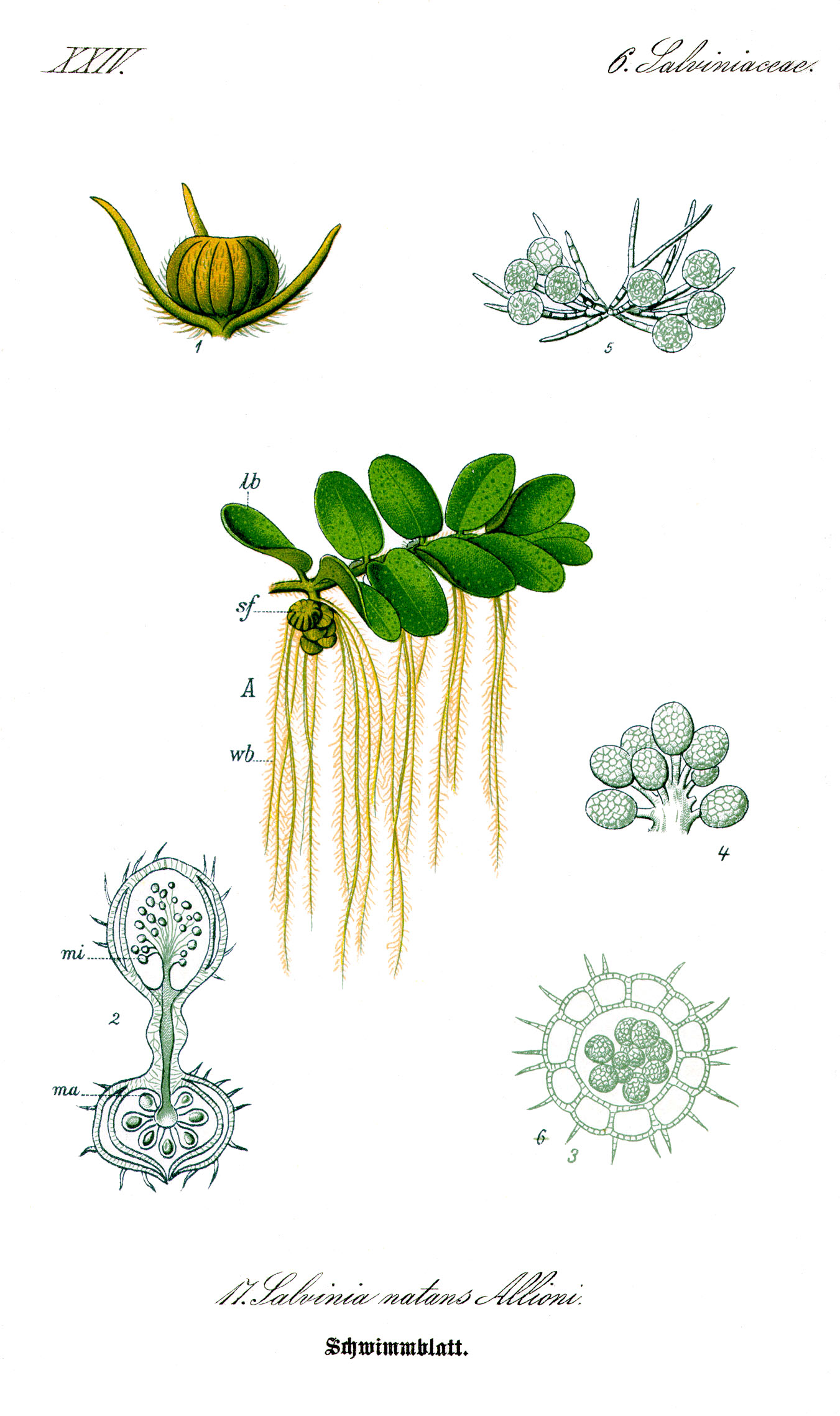 Размножение: спорами. Споры содержатся в специальных органах, прикрепленных к основанию подводного листа. Маленькие шарики со спорами осенью опадают на дно водоема и зимуют там. Весной они дают начало новым растениям. Летом они размножаются вегетативно: из почек, находящихся в узлах стебля, вырастают боковые веточки, которые, отрываясь, начинают самостоятельное существование.