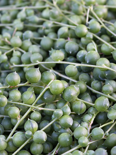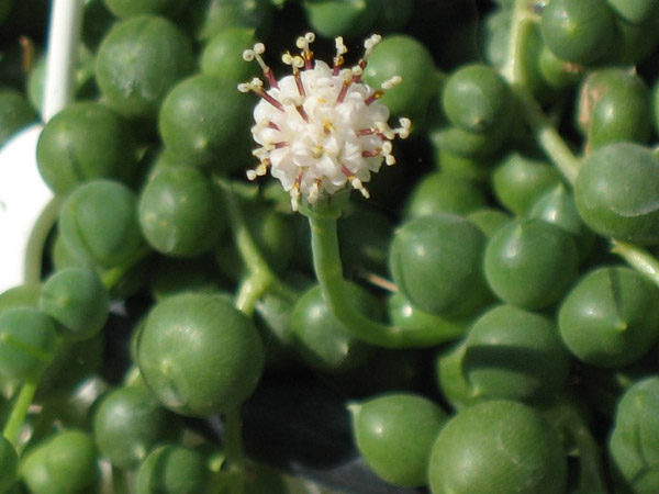 Крестовник Роули Senecio rowleyanus - суккулентное растение, со стелющимися длинными стеблями, укореняющимися в междоузлиях. Листья сферические (похожие на шарики), очередно расположенные, на коротком черешке. Цветки белые, трубчатые, с легким запахом, собраны в верхушечные соцветия корзинки. Выращивают как ампельное растение.