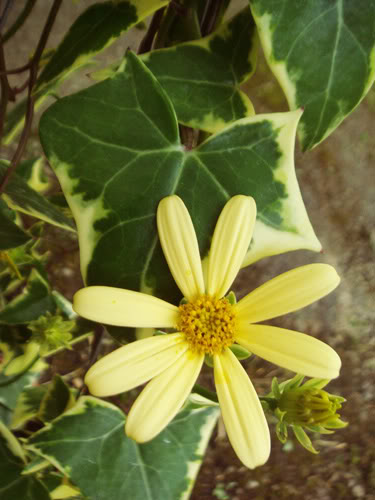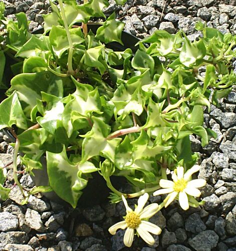 Крестовник крупноязычковый Senecio macroglossus - лиана, с коричневатыми стеблями. Листья расположены очередно, на недлинных черешках, треугольно-стреловидной формы, темно-зеленого цвета, с восковым блеском. Есть разновидности с пестрыми листьями, имеющие белые или желтые пятна - полосы по краям. Может цвести зимой желтыми цветками, собранными в верхушечные или пазушные корзинки. Имеет название - "Натальский плющ", его часто путают с плющом обыкновенным, хотя листья крестовника значительно крупнее.