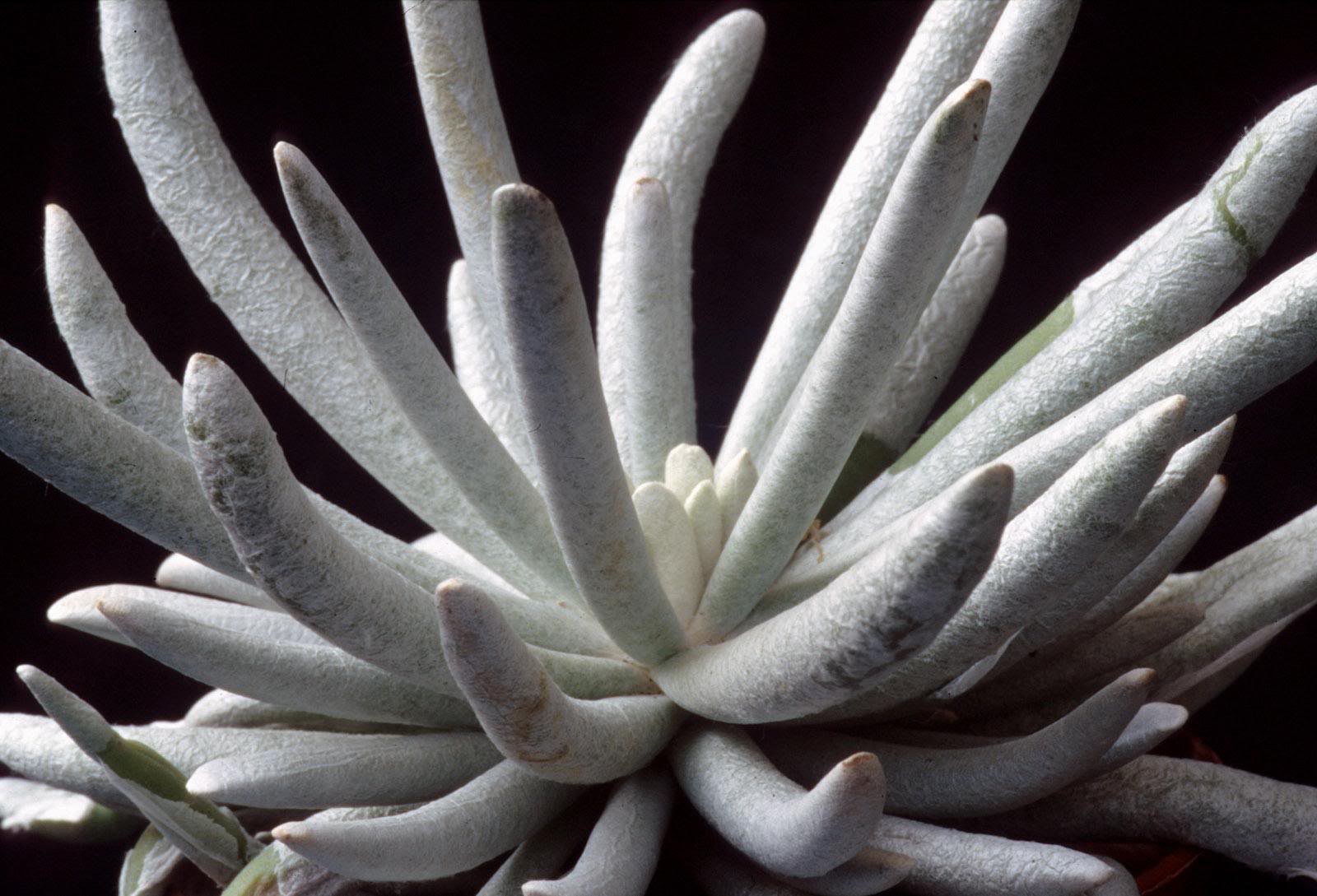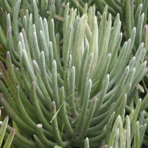 Крестовник стрелконосный Senecio scaposus - суккулентное растение с коротким полегающим стеблем. Листья образуют плотную розетку. Листья двух типов: плоские, широкие и короткие; и длинные цилиндрической формы. Молодые листья покрыты серебристым опушением, старые листья гладкие, зеленого цвета. Цветки собраны в соцветия-корзинки на очень длинных цветоносах.