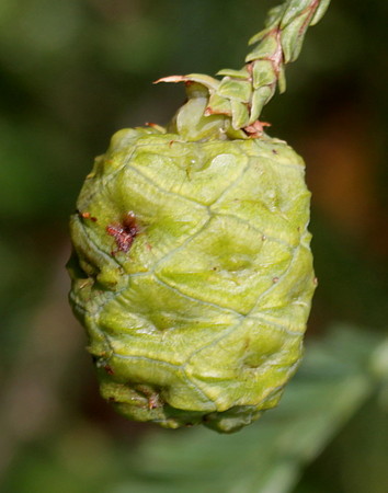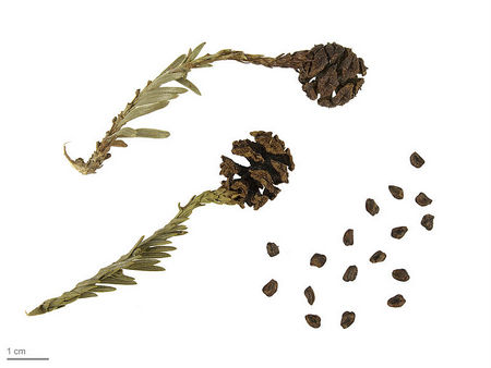Микростробилы мелкие, до 2 мм в длину, желтые, растут на концах молодых побегов. Женские шишки 2-3,5 см в длину и 1-2 см в диаметре, продолговато-яйцевидной, округлой или овальной формы, темно-коричневые при созревании, расположены на верхушках старых веточек. Семенные чешуйки щитовидные, расположены спирально, жесткие, 0,7-1 см в диаметре на верхушке. При созревании шишки широко раскрываются. Семена светло-коричневого цвета, с очень узким крылом, весом 3.3-5.0 мг. Семена появляются с 10-15 лет.