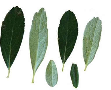 Leaves 1.5–3 (4.5) cm long, obovate to elliptic in shape, base cuneate, apex obtuse, with several rounded teeth near the tip or entire, glabrous on both sides, dark green above, glaucous beneath. Green coloration is retained until late autumn.