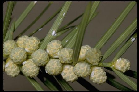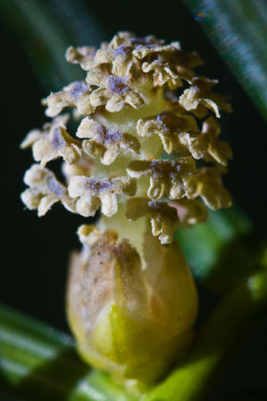 Мужские шишки беловатые. Цветет в июне. Семена со шкуркой 2,5-3,5 см. Присемянник светло-зеленый, с фиолетовыми прожилками. Семена бурого цвета, продолговато-яйцевидные, зреют на 2 год в сентябре-октябре.