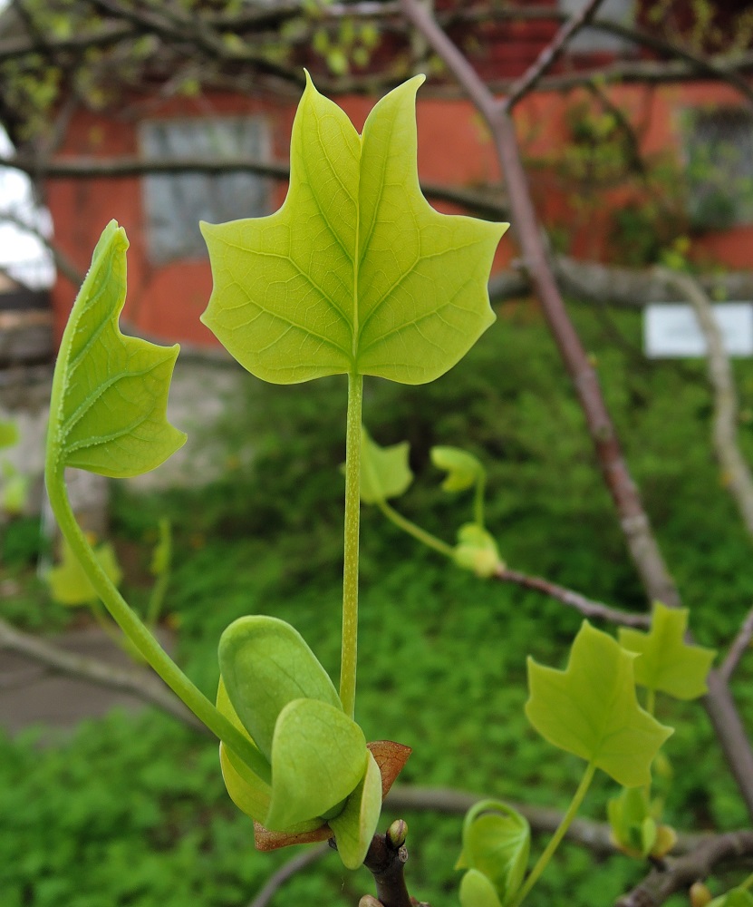 Leaves simple, alternate, 12–20 cm long and 12–18 cm wide, with pinnate venation, light green or green. In autumn leaves take on golden-yellow tones. Leaf shape lyrate, consisting of 4 lobes, with an obcordate, notched apex, resembling a tulip flower. Petiole long, 7-10 cm in length. Stipules large, clasping the twig. Buds elongated and valvate, shaped like a duck's bill.