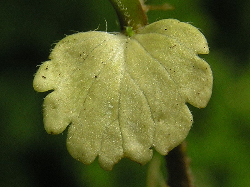 Листья округло-яйцевидной до продолговато-яйцевидной формы, 1,5-3 см в длину и 1-2 см в ширину, туповатые, надрезанно-тупозубчатые или городчатые, реже почти перисто-рассеченные на тупые доли, опущенные, морщинистые, основание округлое или почти сердцевидное. Нижние листья растут на коротком черешке, верхние – сидячие.