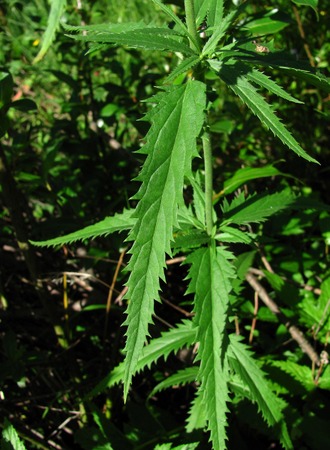 Листорасположение супротивное или по 3-4 в мутовках, продолговатой или продолговато-ланцетной формы и до линейно-ланцетных, 3-15 см в длину и 1-4 см в ширину, черешковые, неравнопильчатые по краю и до верхушки, почти сердцевидные, усеченные или клиновидные в основании и заостренные на верхушке, поверхность голая, реже слабо опушенная. Черешки короткие. Прицветники длиннее цветоножек или такие же, шиловидной или линейной формы.