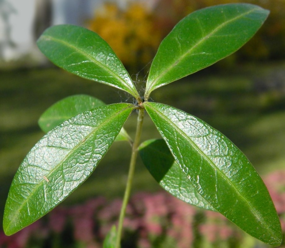 Листья супротивно расположены, кожистые, цельные, на коротких черешках, от широко-ланцетных до яйцевидных, 2-5 см в длину и 2,5 см в ширину, вечнозеленые, острые или туповатые, сверху темно-зеленые, снизу – серо-зеленого цвета, собраны в мутовки по 3 штуки. Черешки 2-5 мм в длину.