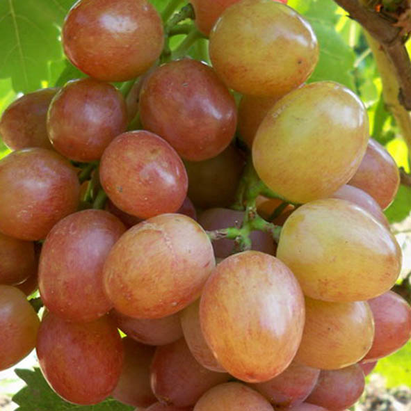 Грозди крупные и очень крупные, 400-800 г, могут достигать 1,5-2 кг, конические, средней плотности, без горошения. Ягоды крупные, весом 8-14 г и размером 31 х 36 мм, похожи на ягоды сорта Талисман, но намного красивее, от овальной до яйцевидной формы. Кожица средней плотности, желтовато-зеленая или желтовато-розовая, при еде не ощущается. Мякоть плотная, немного твердоватая, сочная, гармоничного вкуса. Может довольно долго сохранятся на кустах без потери товарности и вкусовых качеств. Осами не повреждается. Может наблюдаться легкое растрескивание ягод после сильных дождей.