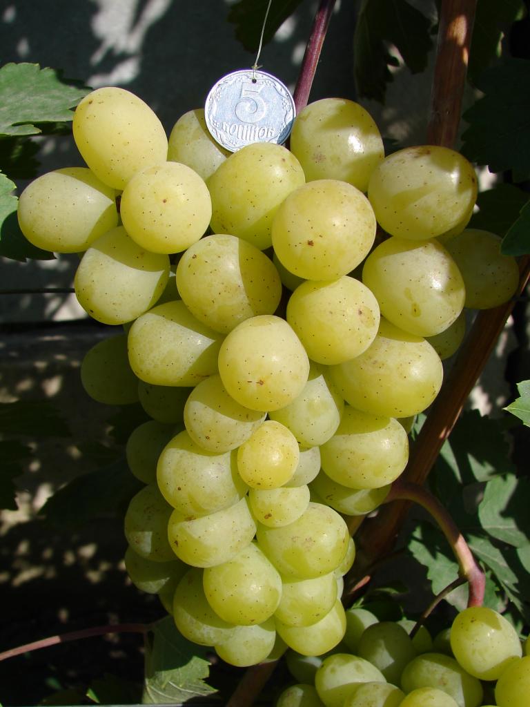 Цветок обоеполый. Грозди очень крупные, до 34,2 см в длину и 18,1 см в ширину, средней плотности, цилиндроконические, весом 870-1150 (1600) г. Длина плодоножки средняя и очень длинная. Ягоды очень крупные, овальные, до 32,5 мм в длину и 26,5 мм в ширину, средняя масса 10,8 г, молочно-белого цвета, матовые. Кожица прочная, съедаемая. Мякоть мясистая, сочная, хрустящая, гармоничного вкуса. Грозди без горошения, ягоды осами не поражаются. Долго сохраняется на кустах без потери потребительских качеств. Зреет в конце августа – начале сентября.