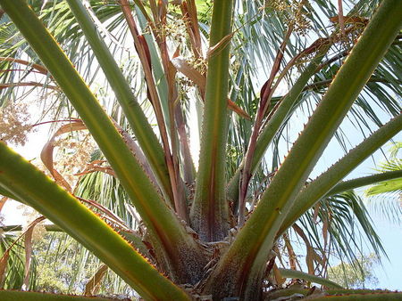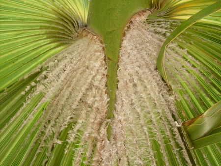 На вершинке ствола расположена компактная и густая крона листьев. Черешки достигают 1 м в длину, красно-коричневого цвета, покрыты по бокам редкими жесткими светло-желтыми или оранжевыми зубцами. Листовые пластинки округлые, пальчато-рассеченные на 2/3 длины, свисающие на концах, глянцевые, темно-зеленые. Нижняя сторона листьев возле черешка опушена.