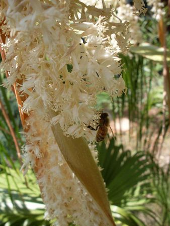 Цветки обоеполые, кремово-белого цвета, собраны в длинные до 3 м ветвистые соцветия (початки), которые представляют собой удлиненные плотные вздутия на осях и завернутые в прицветники, похожи на лепестки. Со временем соцветия становятся повислыми. В комнатных условиях цветет редко, начиная с 12-15 лет.