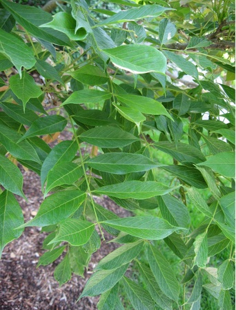 Листья очередные, черешковые, непарноперисто-разделенные, сложные, до 25-35 (40) см в длину, состоят из 11-19 яйцевидно-продолговатых или яйцевидно-эллиптических листочков, 4-8 см в длину и 2-4 см в ширину, с округлым или ширококлиновидным основанием и заостренной верхушкой, густо зеленые, блестящие, опушенные, а затем внезапно оголяющиеся.