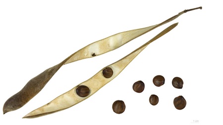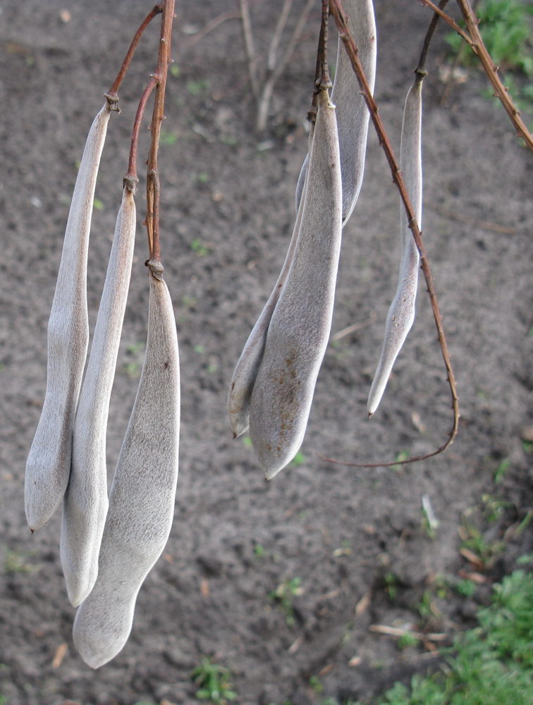 Плоды – бобы 6-15 см в длину и 1,5-2 см в ширину, от зеленовато-коричневых до золотистых, покрыты белым густым опушением, суживающиеся к основанию и суженные между семенами, растрескивающиеся и закручивающиеся после этого. Семена по 2-3 в стручке, почковидно-округлые, коричневые, блестящие, 1,5-2 см в диаметре, зреют с июля по ноябрь. Плоды долго сохраняются на кустах, иногда практически всю зиму.